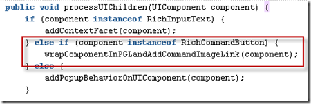 Whenever the commandLink is clicked to enter text editing mode, the page is re-rendered and before rendering takes place, the viewPhaseListenerBean steps in and calls the processPage() method in the pageProcessorForTextEditing bean. This method traverses the UI Component Tree and calls upon a helper method to add the showPopupBehavior listeners.