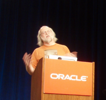 James Gosling, the “father of Java”, is the hero, the star, the god of many Java conferences such as JavaOne. I have seen the adoration and worship, as recently as four months ago at JavaOne 2009. Yesterday I witnessed a performance by James Gosling in a very different setting. At Oracle Open World (at least three times the size of JavaOne) he is seen by many as ‘just an interesting looking gray haired fellow in a T-Shirt and jeans’.