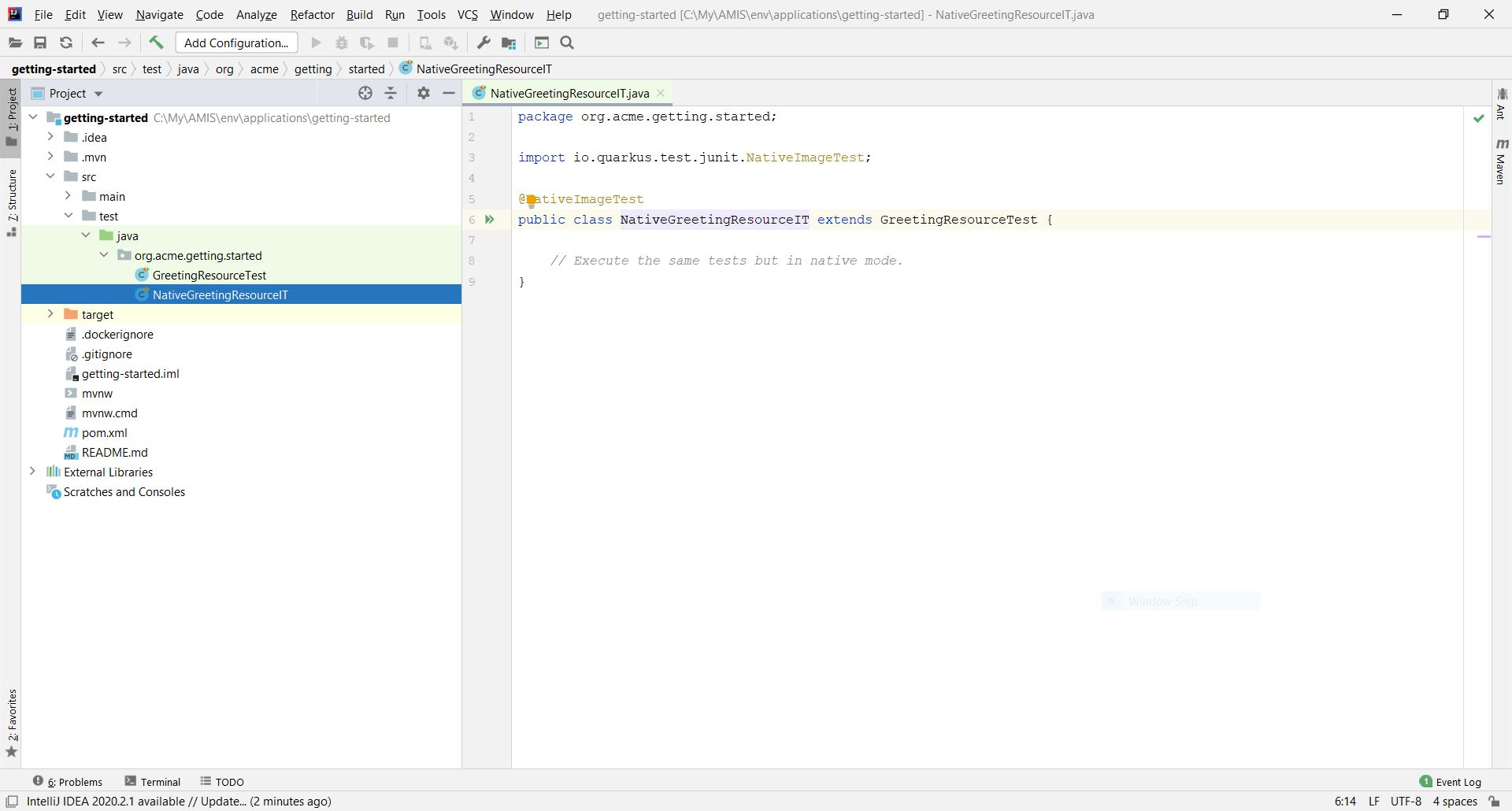 Below, you can see the test file that runs against the native executable. The executable is retrieved using the native.image.path system property configured in the Failsafe Maven Plugin (see pom.xml).