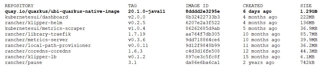 Here you can see the quay.io/quarkus/ubi-quarkus-native-image docker image that was used. Although the code guide has some more topics, for now I will stop and continue later on writing about them.