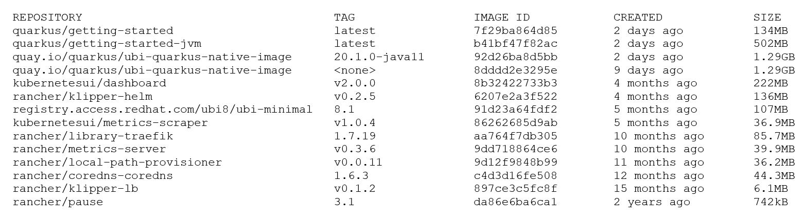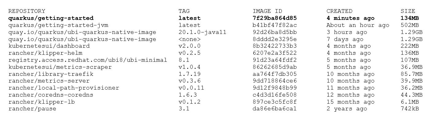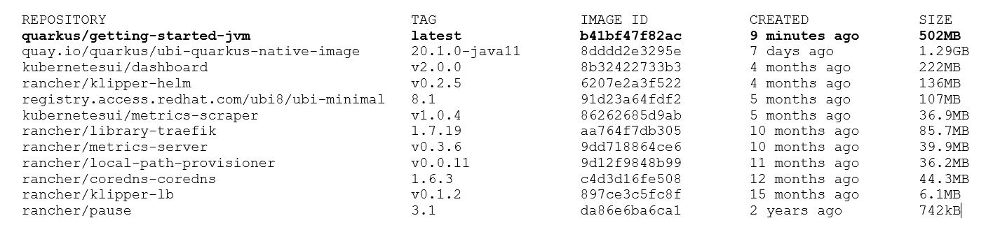 Here you can see that image quarkus/getting-started-jvm:latest is created.