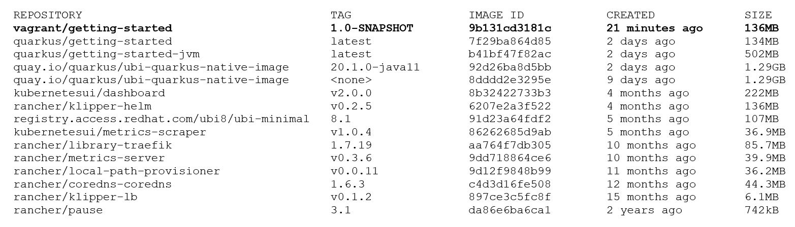 cd /vagrant/applications/getting-started mvn package docker build -f src/main/docker/Dockerfile.jvm -t quarkus/getting-started-jvm .