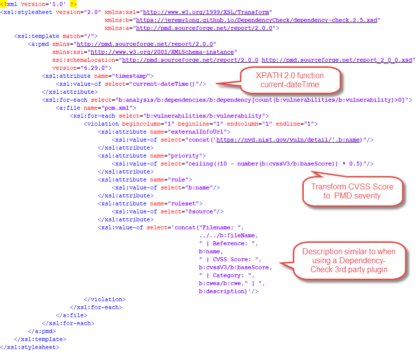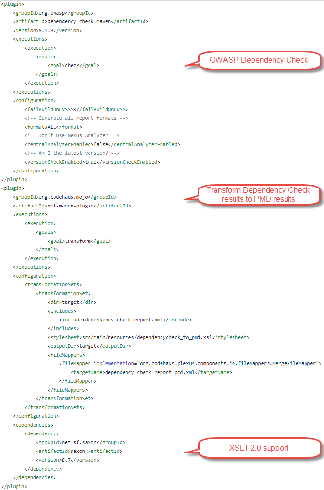 In my pom.xml first the Dependency-Check report needed to be generated before I could perform a transformation. When performing the transformation, I needed to have XSLT 2.0 support to easily get the current date/time for a timestamp. This required an additional dependency. You can take a look at my pom.xml file here. I executed a