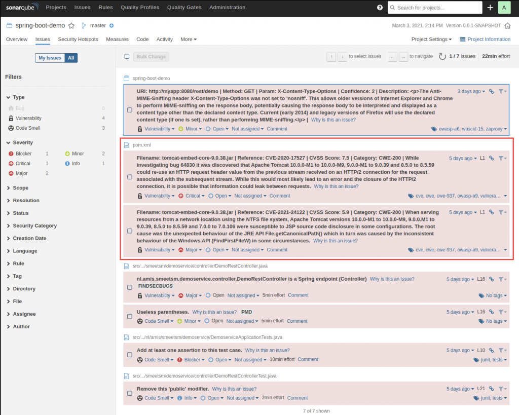 The result of feeding the resulting PMD results file to SonarCloud was that I could see the issues with correct severity in SonarCloud with several interesting fields in the description like the CVSS score and CVE code.