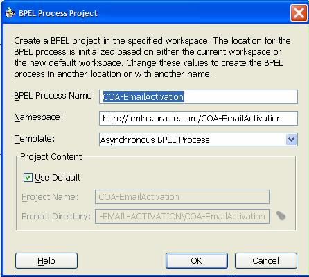 Open the BPEL Process Designer. Create a new Application Workspace (COA-EMAIL-ACTIVATON) and a new BPEL Project (COA-EmailActivation) based on an a-synchronous activity.