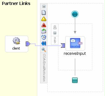 - create a new BPEL process – following the example in the blog by Matt Wright (see resources) – based on an Email Activation Agent