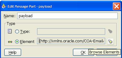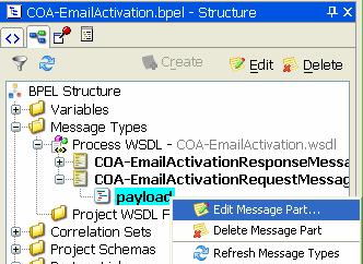 We need to specify the message type of the payload of the request message. To do this go into project structure and expand the Message Types -> Process WSDL structure. Within this expand the Request Message Node (in this example COA-EmailActivationRequestMessage) and right click the payload element and select Edit Message Part