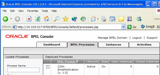 Now let’s start the BPEL Console, when we look at the dashboard, we can see our newly deployed process: