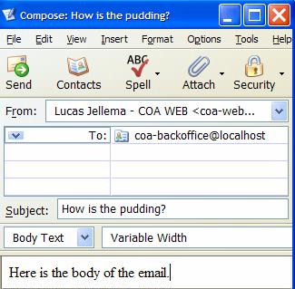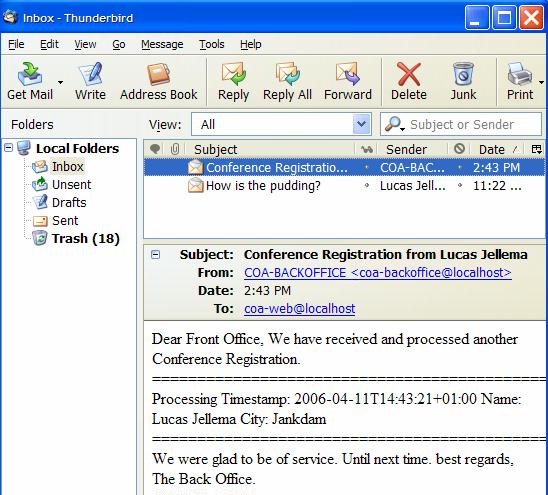 Looking in the Thunderbird Mail Client for the coa-web@localhost account, we find the email that our helpful backoffice has sent us – fully automatically!