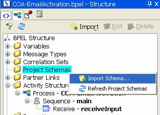 We have to import this XSD into our BPEL Project. Go to the structure window (lower left hand corner) for our BPEL process. Right click on the Project Schemas Node: