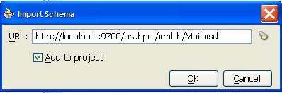 Since we are going to deal with emails in this process, we need to set up the structure of emails through an XSD. Oracle BPEL ships with a Schema Definition for emails, as this structure is standardized. The XSD is called Mail.xsd and can be found at: http://<host>:<port>/orabpel/xmllib/Mail.xsd where <host> is the server on which your BPEL PM Server is installed and <port> is the port that it’s listening on (on my laptop therefore it is at http://localhost:9700/orabpel/xmllib/Mail.xsd).