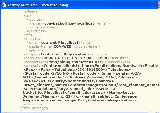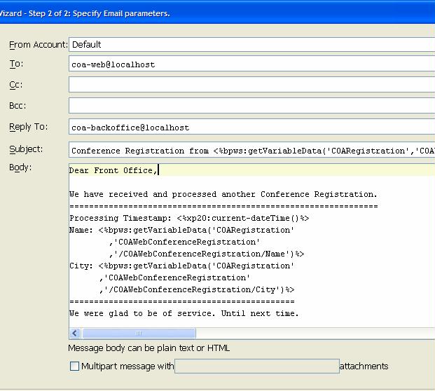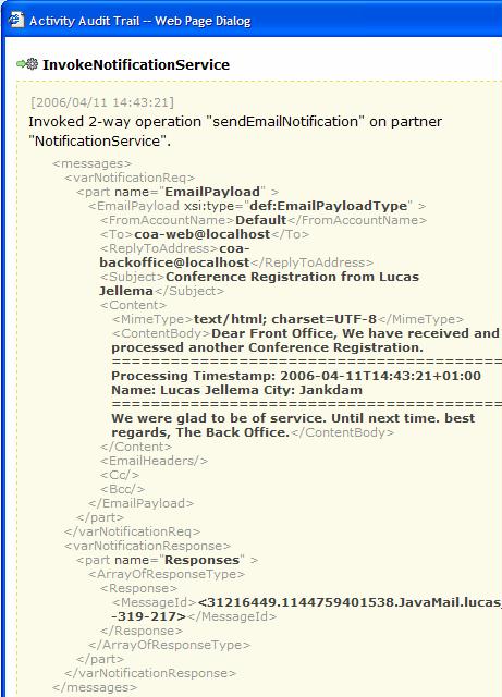 - send an email to the front-office, informing on the ConferenceRegistration that was received via email and has now been handled; this email is sent by the standard Oracle BPEL Notification Task; configuration of the Email Account and Server to send the email from is done in the file BPEL_HOME\integration\orabpel\system\services\config\ns_emails.xml
