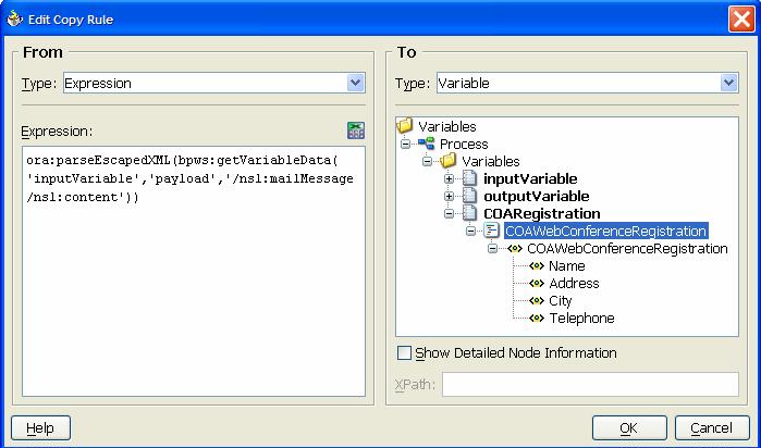 Now we make use of this variable: it will provide the structured ConferenceRegistration, parsed from the unstructured “XML” String in the email body. We will create an Assign activity that will copy the parsed as XML content from the email to the COAWebConferenceRegistration part of the COARegistration variable. Key for this operation is the function ora:parseEscapedXML that I found out about more or less accidentally. This function takes a piece of unstructured text (a string) and parses it into a DOM element, that can futher be manipulated.