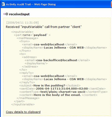 Here we have specified – using the MailActivationAgent, a standard component of Oracle BPEL PM – that every 35 seconds (heartBeatInterval), the BPEL Container should check the coa-backoffice mail account for new emails. Any new email found should trigger the start of a new process instance. The email message itself is used as payload for the RequestMessage with which the process is started.