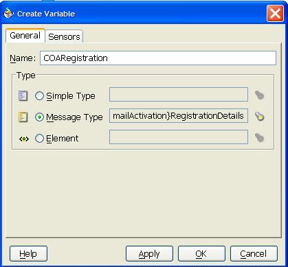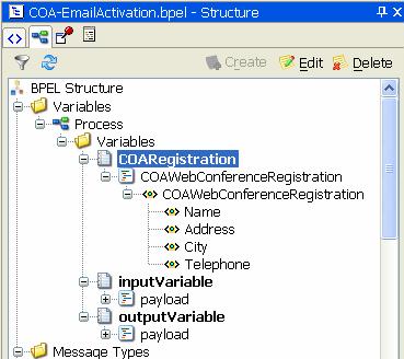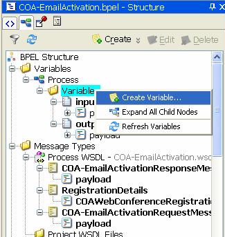 First, let’s create a new variable, called COARegistration. It is based on the RegistrationDetails message(type), and specifically its COAWebConferenceRegistration part. Go to the structure window for the COA-EmailActivation.bpel file. Locate the node Variables. Right click and select Create.