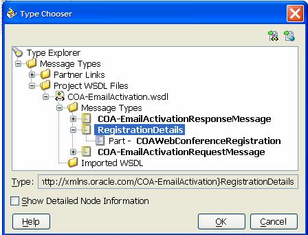 Select the radio button Message Type and click on the Browse Types icon. The Type Chooser opens. Select the Registration Details message that we have just created in the project’s WSDL file.