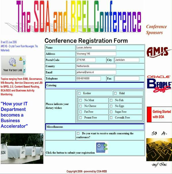 Time to re-deploy our BPEL process. When deployment is complete and successful, we can do another Registration for the Conference on the website. This should cause an email to be sent, a BPEL Process instance to be initiated and eventually another email to be sent to the coa-web account in the front-office.