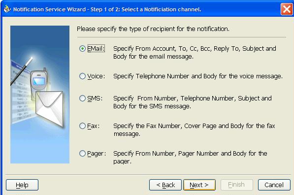 The last step in our process will be to send an email to the front office (coa-web@localhost), informing on the ConferenceRegistration that was received via email and has now been handled. Sending emails is a standard operation in Oracle BPEL PM. We can use the Notification Task. Drag the Notification activity from the component palet and drop it just after the ParseXMLfromEmailIntoVariable activity. The Notification Service Wizard is started. We can choose several communication mechanisms for sending out our notification, including the classic fax and SMS text messages. We select EMail.