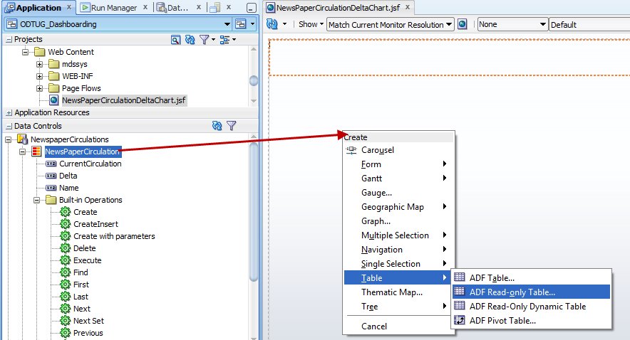 Download the JDeveloper 11gR2 application with the sources from this article: DeltaGraphAndODTUG_Dashboarding.