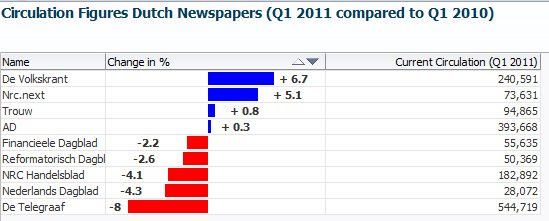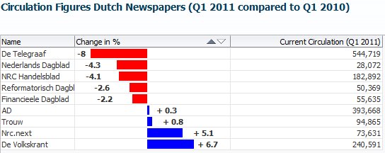 The other day, my newspaper printed the next figure that illustrates the changes in circulation for all Dutch newspapers – comparing the 1st quarter of 2011 with one year ago.