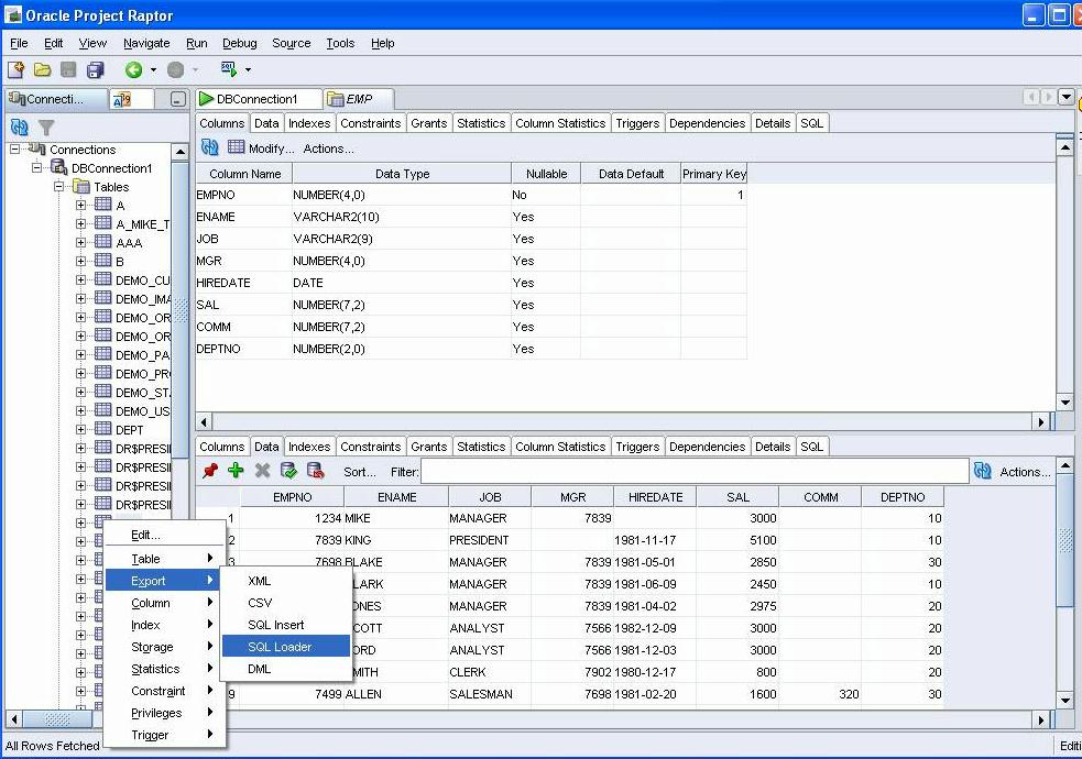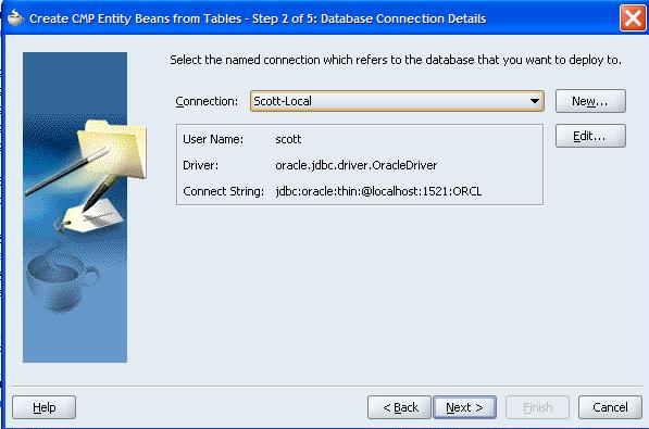 The wizard then prompts us for the Database Connection (Scott Local) and let’s us choose the table to create the Entities for: EMP and DEPT. You can set the names for the Entities – by default they are the same as the Table Names.