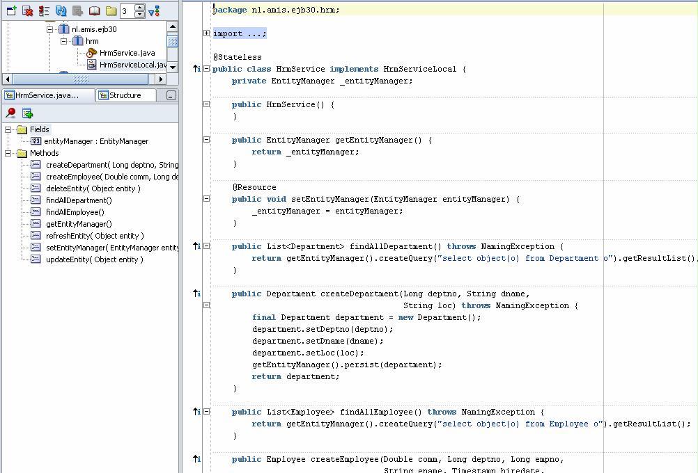 There is one thing though that we must change: the setEntityManager method is annotated with @Resource. That is an instruction to the EJB Container to inject the actual EntityManager instance. Clearly, since our application is a J2SE stand alone out of container application, we need to inject the EntityManager manually. Note: the HrmServiceLocal interface that was generated by the wizard is completely irrelevant for our application. The next screenshot demonstrates how the HrmService class is changed, to set the EntityManager during instantiation. Of course this hard coded solution is not appropriate for a real application!