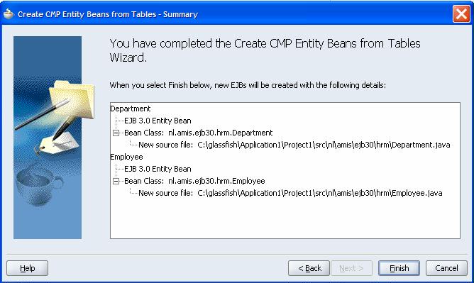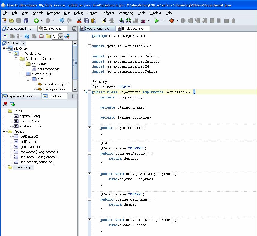 The wizard generates two Entities for us, classes Employee and Department. POJOs with all properties, getters and setters for the columns in tables EMP and DEPT. And with all EJB 3.0 annotations to instruct EntityManagers on persisting these entities to the underlying database tables: