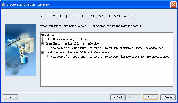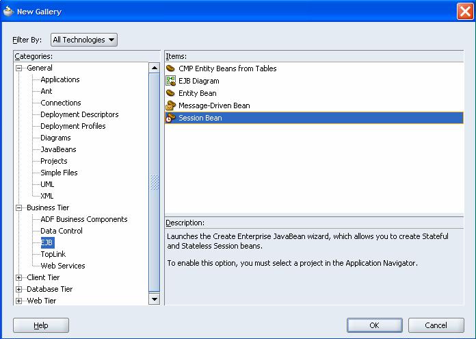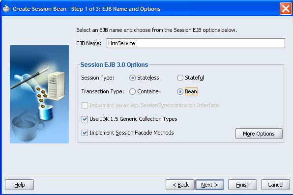 Creating such a Business Service object is simple in JDeveloper. Use the EJB Session Bean wizard to generate a Session Bean. We can finetune this session bean, but it is a perfect no-hand-code starting point for our HrmService class. Go to New, Business Tier, EJB and select Session Bean.