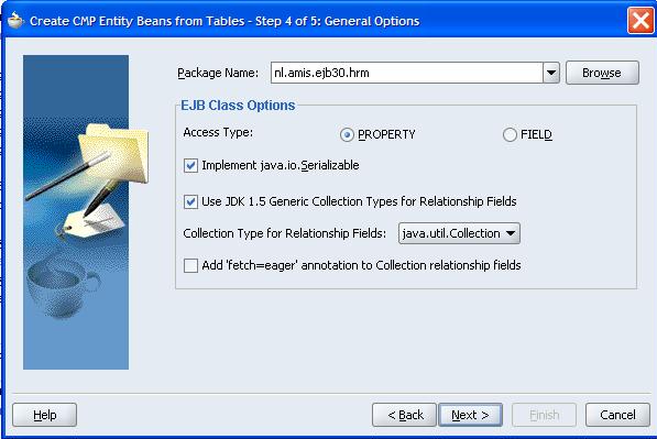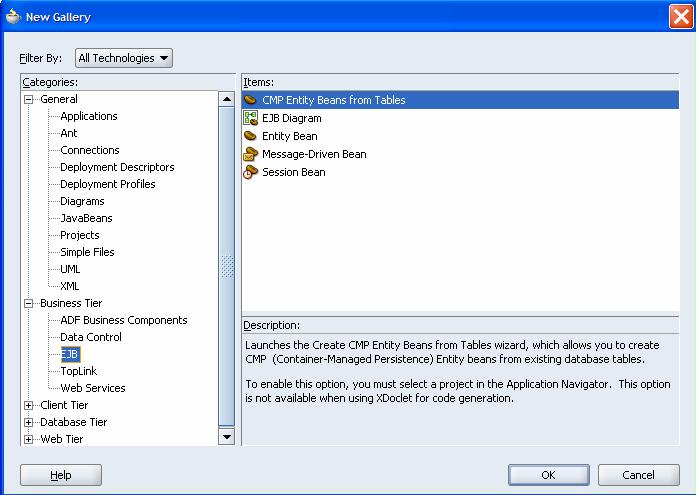 Then it’s time to start using a wizard. Go to the New Gallery, the Business Tier, EJB node. Select the Item CMP Entity Beans from Tables. This will create annotated POJOs: entities (or domain classes) that contain the required mapping information in EJB 3.0 format, directly derived from the existing database tables. It is not exactly the pure ‘let’s do some UML modelling first and worry about database implementation later’ approach, but given an existing database, it is very pragmatical.