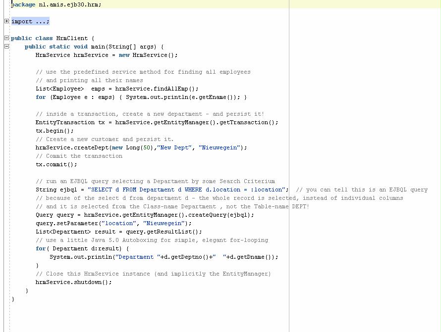 You can now immediately start writing your own code, directly against the javax.persistence API for EntityManagerFactory and EntityManager, manipulating Employees and Departments. However, it is much neater and better structured to create a Business Service that provides methods – services – for the manipulations and special queries that the application may desire. This Business Service will make use of the javax.persistence API, but the application itself does not. So we are aiming for a HrmService class that provides these services to applications interested in working with Employees and Departments. It is like an out-of-container Session Bean implementing a Facade.