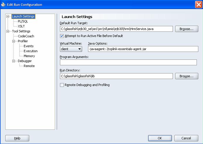< <>>There are three important things to do on this Edit Configuration Tab: set the Virtual Machine to Client. This has to do with the javaagent option that we will set next: in the Java Options input field, enter: -javaagent:.\toplink-essentials-agent.jar. In the Run Directory enter the $Glassfish_Home\lib directory.>