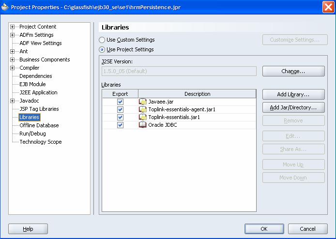 Next, go to the Libraries Tab. Here we specify which jars to include on the Classpath when we compile and run our application. The first three jars are taken from the GlassFish installation and represent the Reference Implementation for the EJB 3.0 javax.persistence interfaces. Oracle JDBC is a built in JDeveloper library with jars for the Oracle (JDBC) Driver.