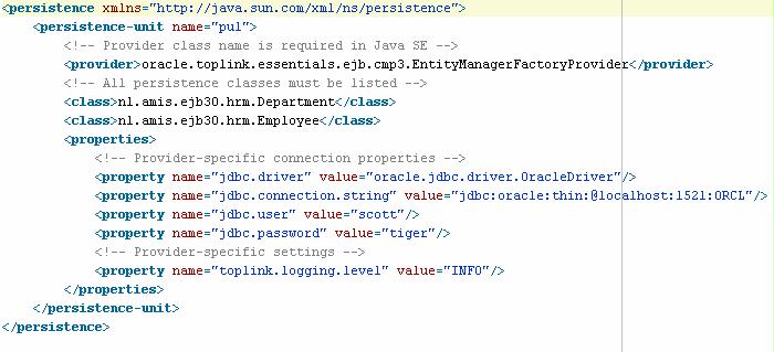 Before we can run the application, we have to create the persistence.xml file in the src\META-INF directory of our project. This file contains the configuration details for our EntityManager, such as the database connection and jdbc driver we are using. Note: these details can also be passed to the EntityManagerFactory in a Map, in a purely programmatical way.