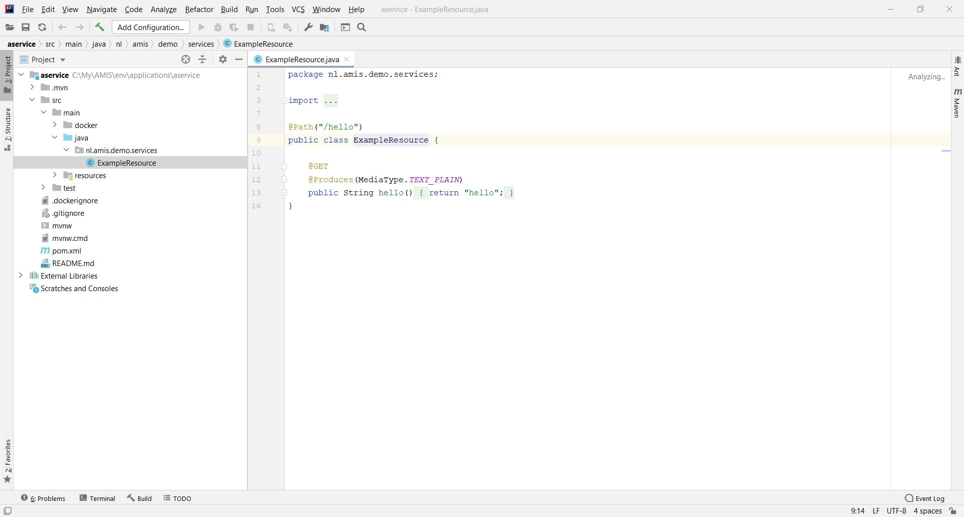 Within IntelliJ IDEA, I imported the project and selected directory: C:\My\AMIS\env\applications\aservice. Next, I chose “Import project from external model: Maven” and kept the rest as default.
