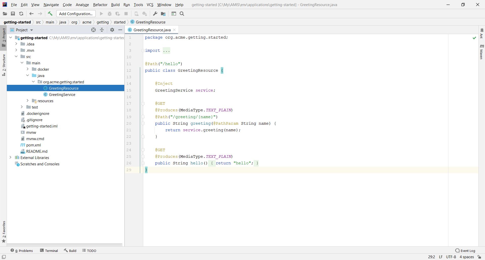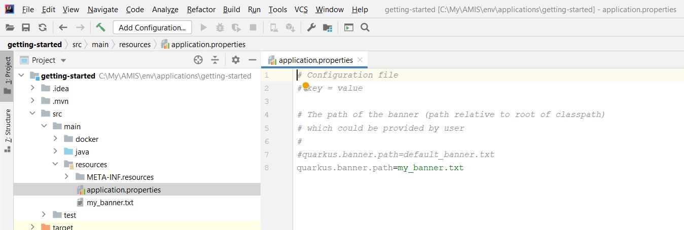 Within IntelliJ IDEA, I imported the project (in the same way as before) by selecting directory: C:\My\AMIS\env\applications\getting-started.