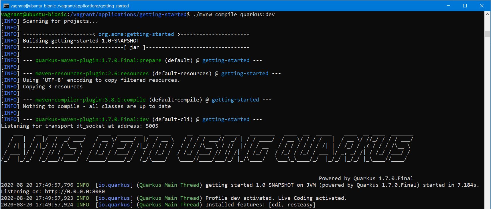 [INFO] Scanning for projects... [INFO] [INFO] ------------------< org.apache.maven:standalone-pom >------------------- [INFO] Building Maven Stub Project (No POM) 1 [INFO] --------------------------------[ pom ]--------------------------------- [INFO] [INFO] --- quarkus-maven-plugin:1.7.0.Final:create (default-cli) @ standalone-pom --- Downloading from central: https://repo.maven.apache.org/maven2/io/quarkus/quarkus-universe-bom/maven-metadata.xml ... Downloaded from central: https://repo.maven.apache.org/maven2/org/antlr/antlr4-runtime/4.5/antlr4-runtime-4.5.jar (374 kB at 94 kB/s) [INFO] [INFO] Maven Wrapper version 0.5.6 has been successfully set up for your project. [INFO] Using Apache Maven: 3.6.3 [INFO] Repo URL in properties file: https://repo.maven.apache.org/maven2 [INFO] [INFO] [INFO] ======================================================================================== [INFO] Your new application has been created in /vagrant/applications/getting-started [INFO] Navigate into this directory and launch your application with mvn quarkus:dev [INFO] Your application will be accessible on http://localhost:8080 [INFO] ======================================================================================== [INFO] [INFO] ------------------------------------------------------------------------ [INFO] BUILD SUCCESS [INFO] ------------------------------------------------------------------------ [INFO] Total time: 25.961 s [INFO] Finished at: 2020-08-20T16:58:23Z [INFO] ------------------------------------------------------------------------ vagrant@ubuntu-bionic:/vagrant/applications$ cd getting-started vagrant@ubuntu-bionic:/vagrant/applications/getting-started$