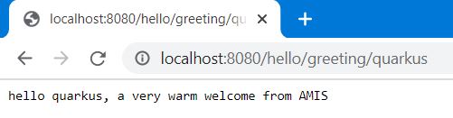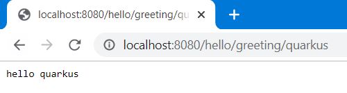 Then, in the Web Browser on my Windows laptop, I entered the URL: http://localhost:8080/greeting/quarkus