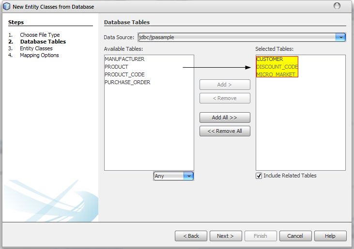 5. Select the Customer table from the Available Tables and click Add. Click Next.The customertable and  related tables will be placed under Selected Tables.WebLogic 12c: Use JPA in your Web Application New Entity Classes from Database 2012 02 14 13 28 22