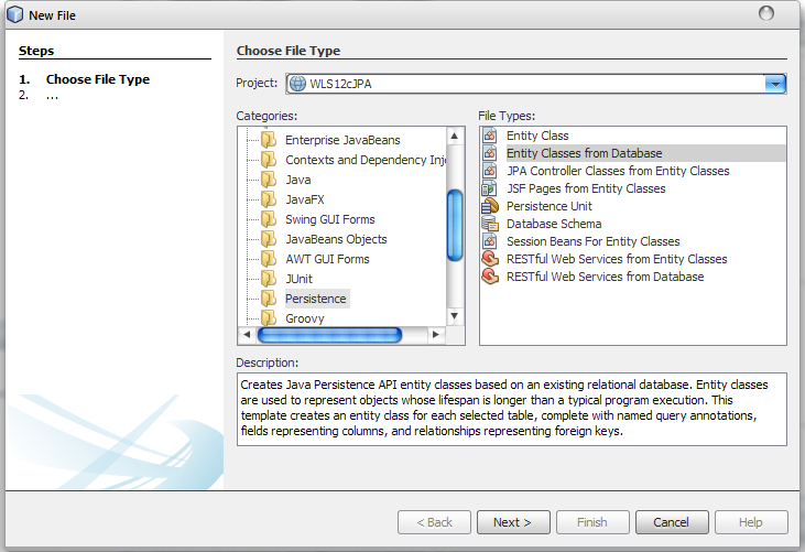 2. Select from Persistence JSF Pages from Entity Classes in the JavaServer Faces category . Click Next.WebLogic 12c: Use JPA in your Web Application New File 2012 02 14 13 43 11