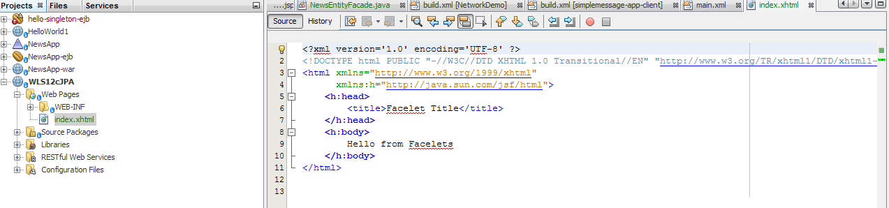 NetBeans creates the web application project and opens index.xhtml in the editor. The faces/index.xhtml acts as the default index page.In WebLogic 12c your weblogic.xml shows no reference anymore to JSF