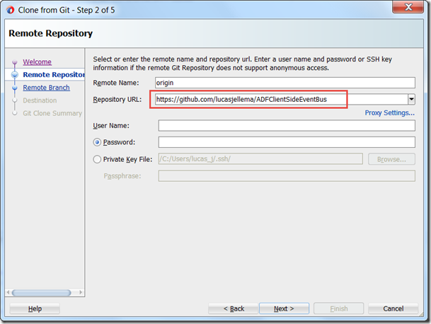 Press Next. Specify the GitHub URL for the remote repository. For public repositories you do not need a username and password, at least not until you start pushing changes.
