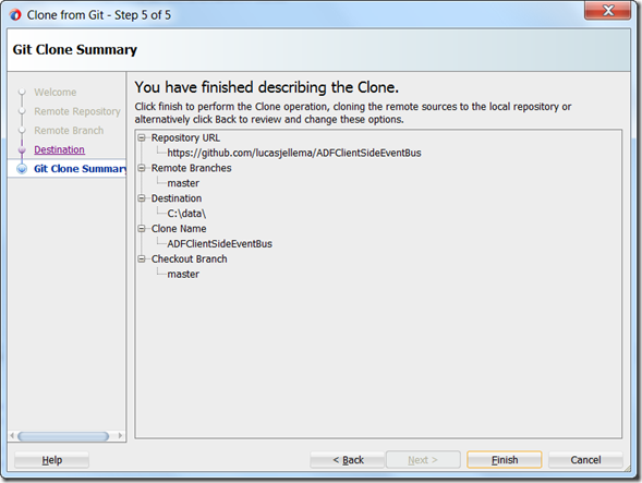 There it is, all the code that was in the remote repository on GitHub, cloned locally to the file system and ready to run in JDeveloper. By running a simple wizard that required two pieces of information: the URL of the remote repository and the destination directory on the local file system.