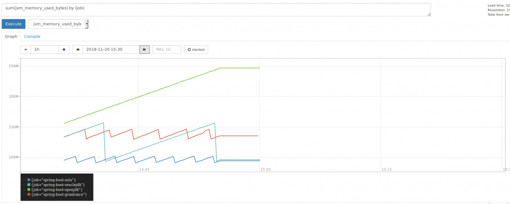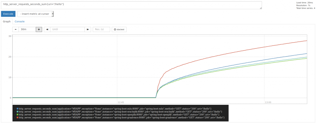 Overview I’ve conducted a load test using SOAP UI with a reactive Spring Boot REST application running on 4 different JVMs behind a round robin haproxy load balancer. I’ve used Prometheus to poll the JVM instances (which used Micrometer to produce data) every 5 seconds and used Grafana and Prometheus to visualize the data. The results would suggest GraalVM is not a suitable drop-in replacement JVM for for example OpenJDK since it performs worse, uses more resources, loads more classes and spends more time in garbage collection.