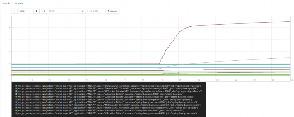 Below is a graph of the sum of the GC pause times. The longest pause times (the one line on top) are GC pause times due to allocation failures in GraalVM.