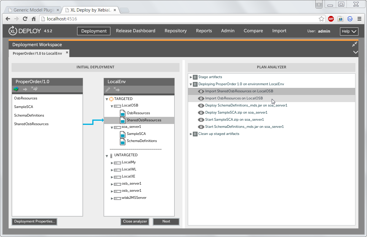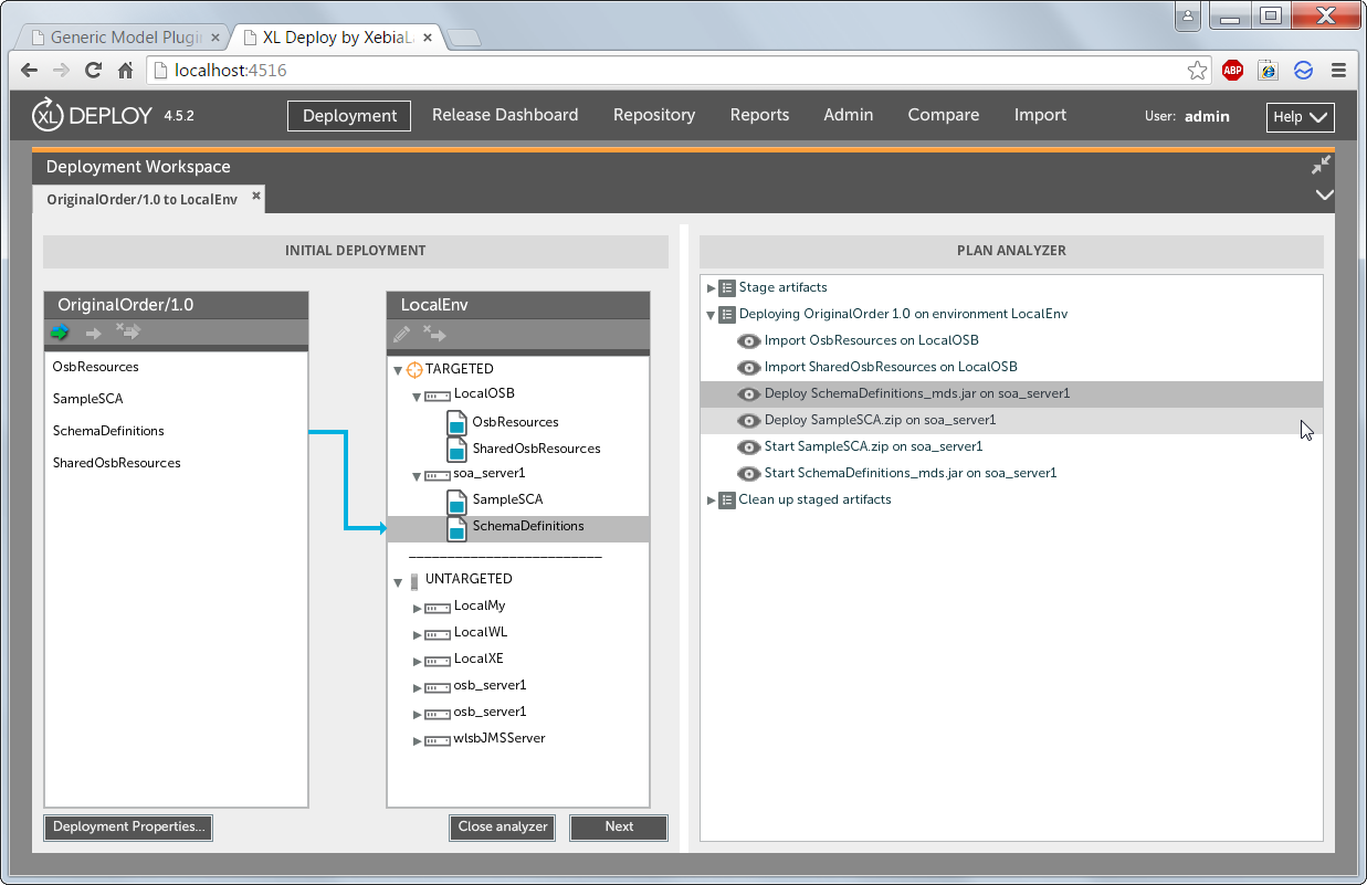 For Service Bus, the XL Deploy plugin comes with one generic type: osb.Configuration. It contains a configuration archive with optional customization file(s). If we provide a set of such artifacts, the generated deployment plan will show up just in lexicographical order as they are assigned with the default deployment order value 60. This way we cannot have any influence on the sequence. Furthermore, the order property is defined as hidden so manual adjustment of the mapped artifact is excluded too.