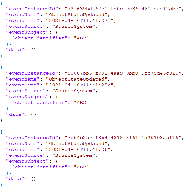 This flow has 3 generate GenerateFlowFile processors. They generate the following 3 messages. Note only the eventTime and eventInstanceId differ;