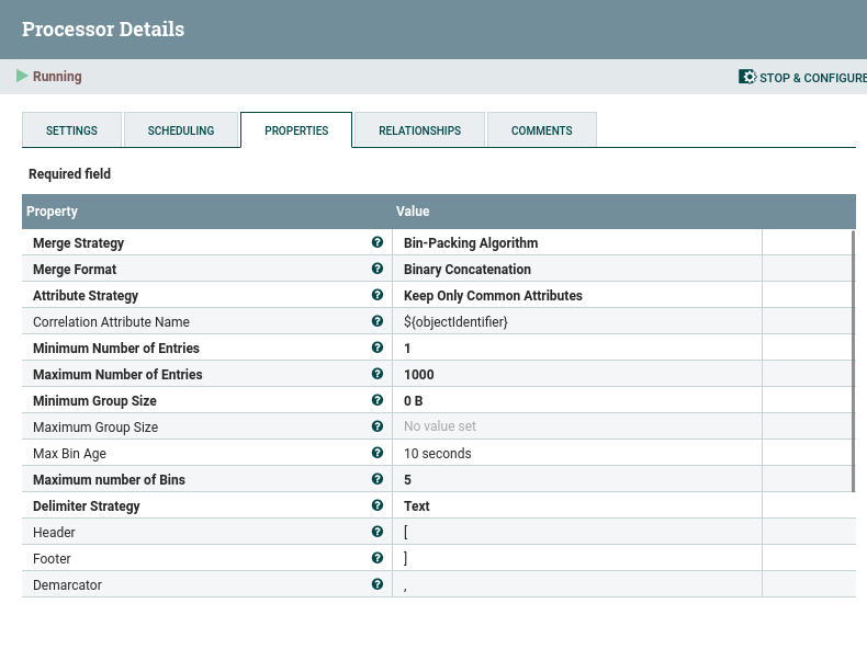 The MergeContent processor merges the separate JSON messages into one large JSON flowfile for a period of 10 seconds. Mind that the maximum number of messages is in this example set to 1000. If more than 1000 messages arrive with the same objectIdentifier within 10 seconds, the surplus messages will go to the failure relationship. Also mind that the maximum number of bins (5 in the above screenshot) indicates how many different objectIdentifier bins will be held in memory at the same time. You probably want to increase both numbers for a real life scenario.