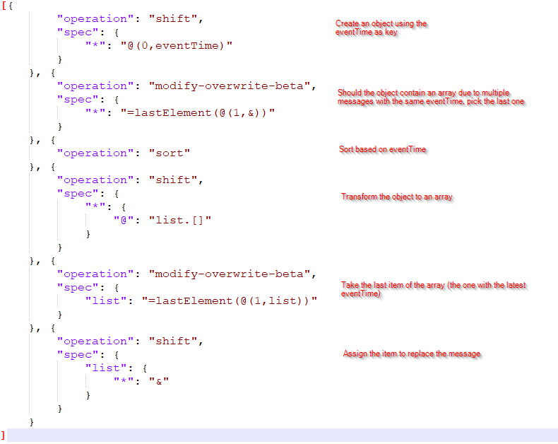 You can download the transformation here. It first sorts based on eventtime and then it takes the latest one. In this example, the message with the eventTime “2021-04-16T11:41:28Z” (the second message). If there are several messages with the same eventTime, the latest message received, is passed along. N.b. this transformation can most likely be improved upon.