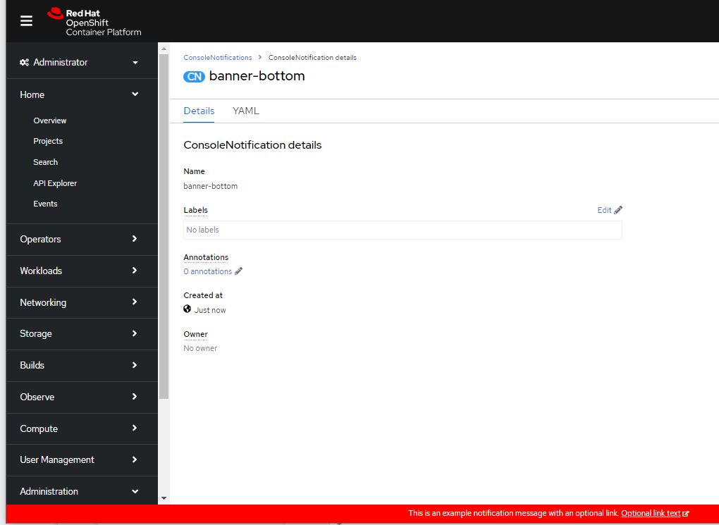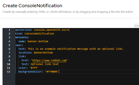 - From Administration => Custom Resource Definition, click on ConsoleNotification link