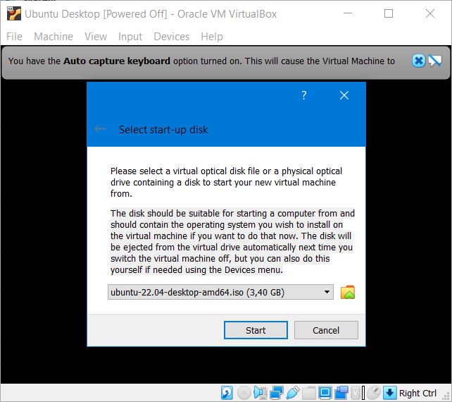 Click the ‘Start’ button to launch the virtual machine. You will be prompted to select the start-up disk. Use the file icon to open the Optical disc selector and click Add to find your .iso file.